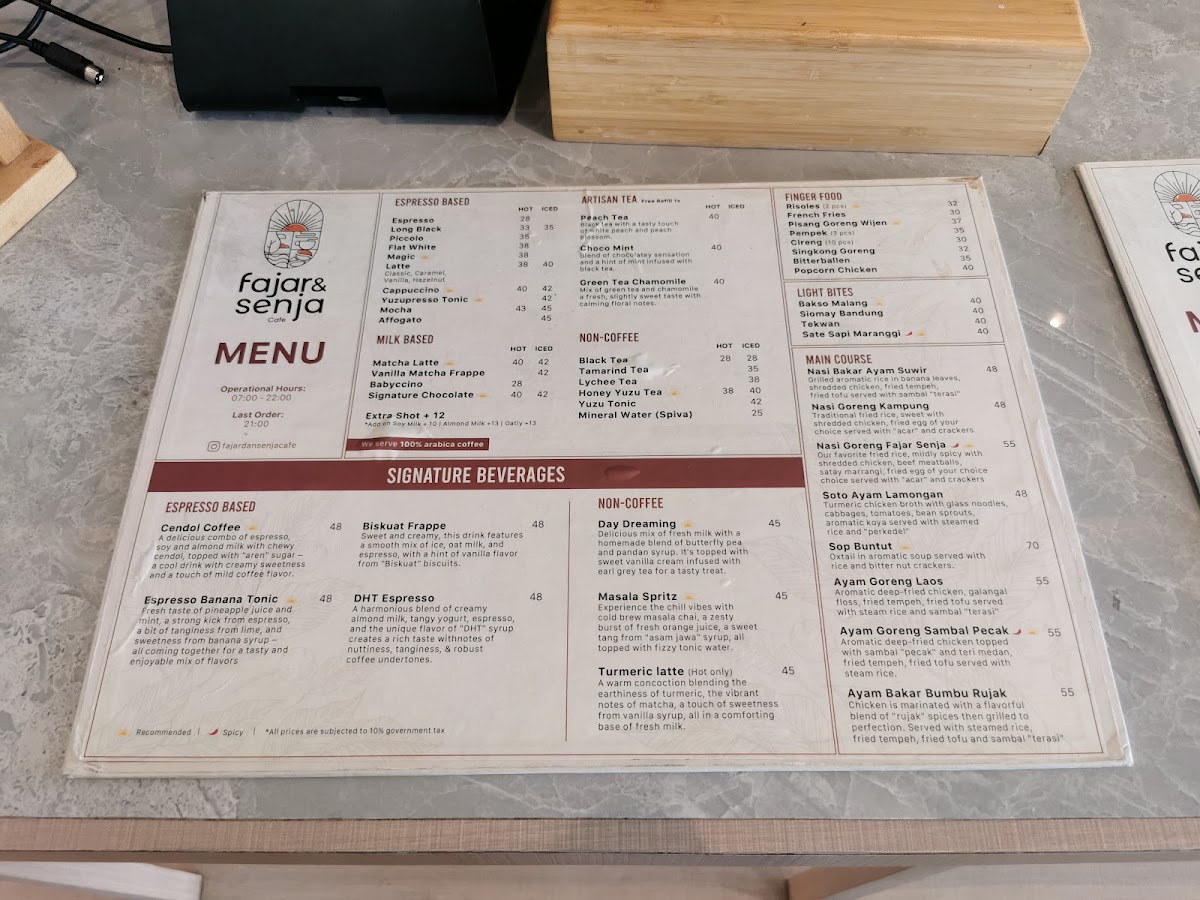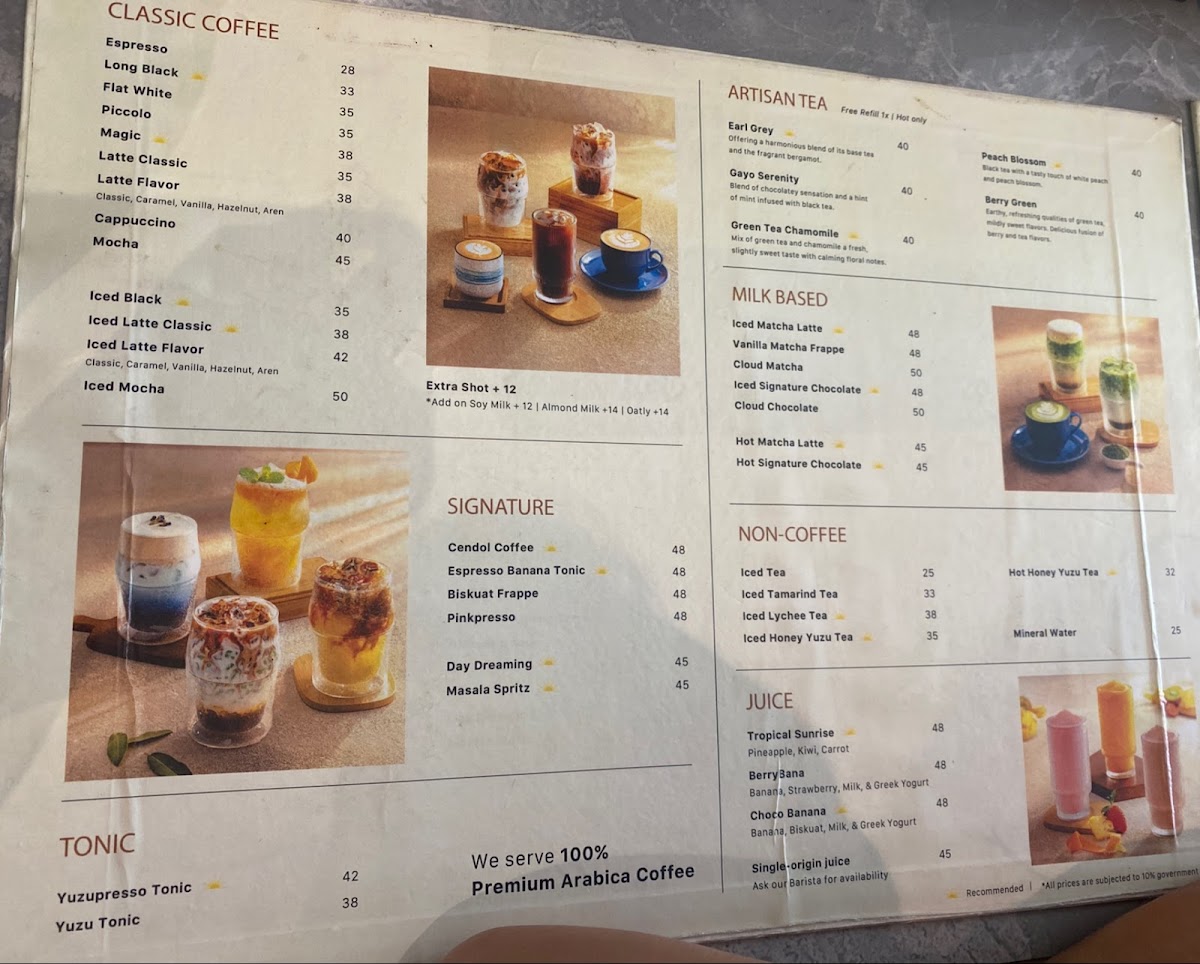The menu at Fajar & Senja Cafe - Alam Sutera offers a variety of food and drink options suitable for different times of the day, including breakfast, coffee breaks, and light meals. Visitors can expect a selection of coffees such as espresso-based drinks including cappuccino, long black, and specialty items like Matcha Latte and Cendol Coffee. Tea options like Peach Tea are also available.
